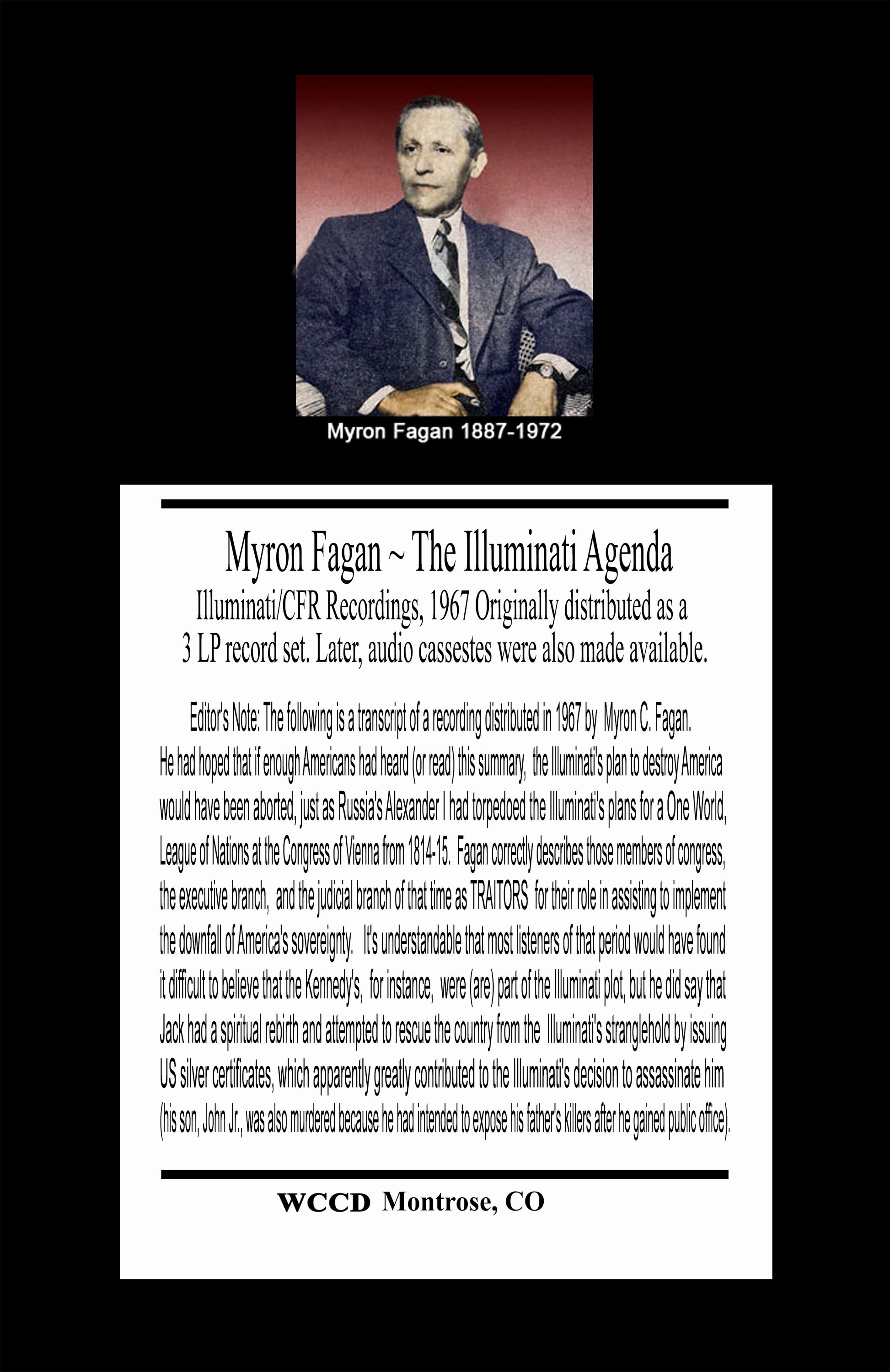 Editor's Note: The following is a transcript of a recording distributed in 1967 by Myron C. Fagan. He had hoped that if enough Americans had heard (or read) this summary, the Illuminati's plan to destroy America would have been aborted, just as Russia's Alexander I had torpedoed the Illuminati's plans for a One World, League of Nations at the Congress of Vienna from 1814-15. Fagan correctly describes those members of congress, the executive branch, and the judicial branch of that time as TRAITORS for their role in assisting to implement the downfall of America's sovereignty. It's understandable that most listeners of that period would have found it difficult to believe that the Kennedy's, for instance, were (are) part of the Illuminati plot, but he did say that Jack had a spiritual rebirth and attempted to rescue the country from the Illuminati's stranglehold by issuing US silver certificates, which apparently greatly contributed to the Illuminati's decision to assassinate him (his son, John Jr., was also murdered because he had intended to expose his father's killers after he gained public office).